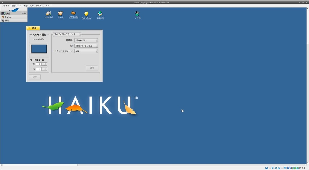 →「画面」アプリの解像度の値は見えないかもしれませんが、UEFI でVirtualBox のHaiku を立ち上げると、最大解像度(7680x4320)に設定されてしまいます。