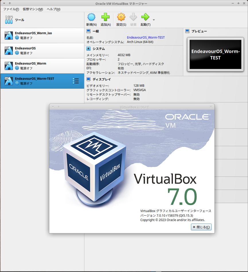 $ apt search virtualbox-7.0 : virtualbox-7.0/now 7.0.10-158379~Ubuntu~jammy amd64 [インストール済み、ローカル] Oracle VM VirtualBox