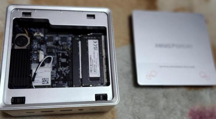 こちらの「MINISFORUM NAB5」は、上蓋(うわぶた)の 手前 2箇所を押す と上蓋が開く、パーツ交換がやりやすい構造です。また、上板と底板以外はひんやりした金属?なので、外観もクールで、冷却性能も良さそう。