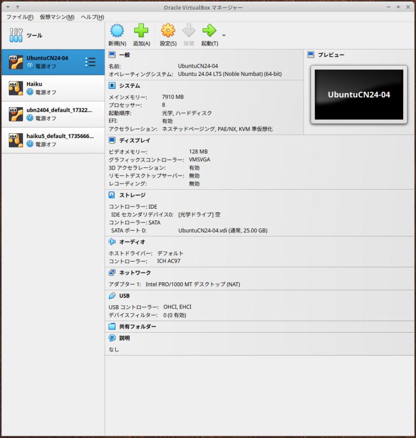 $ ls -lA ~/'VirtualBox VMs' : drwxrwxr-x 3 ubn ubn 4096 1月 12 20:59 Haiku drwxrwxr-x 3 ubn ubn 4096 11月 13 2024 UbuntuCN24-04 drwx------ 3 ubn ubn 4096 1月 24 11:13 haiku5_default_1735666924757_81252 drwx------ 3 ubn ubn 4096 12月 10 2024 ubn2404_default_1732203971971_45140
