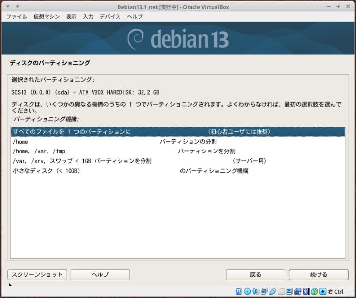 $ cd ~/ダウンロード/debian/ $ ls -1 : debian-13.1.0-amd64-netinst.iso ←(こちら) debian-live-13.1.0-amd64-xfce.iso debian-live-13.1.0-amd64-xfce.iso.packages