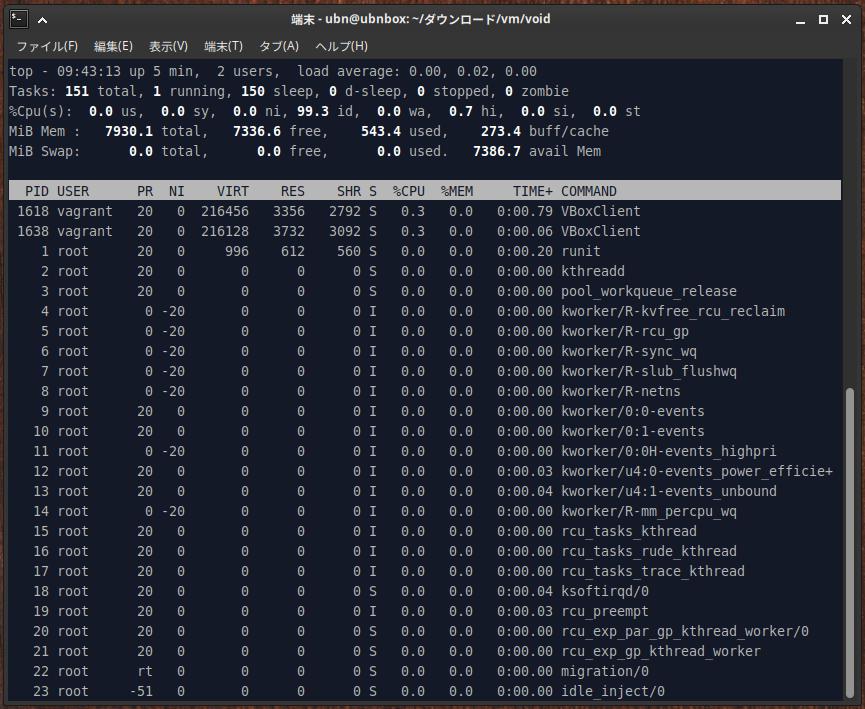 「仮想マシン」に使った「Void Linux」は、「コンソール」画面の「ログイン待ち」までなら、あっという間に、起動され、